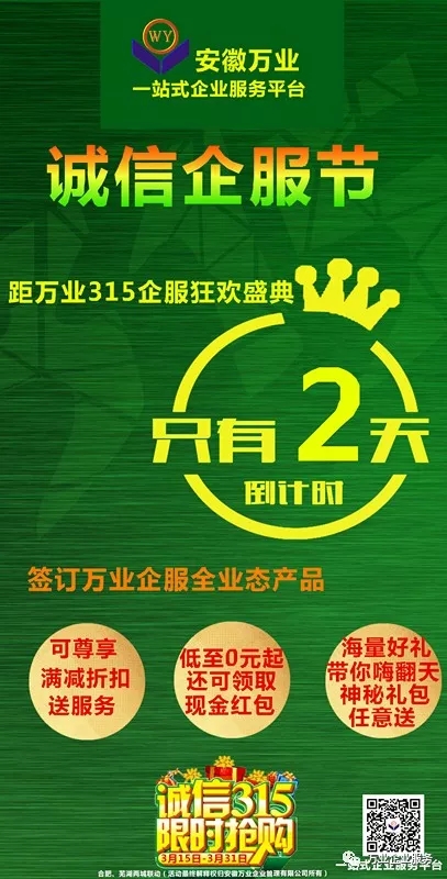 315來源 315即國際消費者權(quán)益日,定于每年的3月15日,因為在1962年的3月15日時任美國總統(tǒng)的約翰·肯尼迪在美國國會發(fā)表《關(guān)于保護消費者利益的總統(tǒng)特別咨文》一文,文中首次提出了著名的消費者四項權(quán)利。最早由國際消費者聯(lián)盟組織于1983年確定,目的在于擴大消費者權(quán)益保護的宣傳,使之在世界范圍內(nèi)得到重視,促進各國和地區(qū)消費者組織之間的合作與交往,在國際范圍內(nèi)更好地保護消費者權(quán)益。 現(xiàn)為了響應(yīng)315誠信服務(wù)消費者的號召,安徽萬業(yè)特推出315企服節(jié)盛典活動。 距315企服節(jié)盛典還有2天 誠信企服節(jié) 即將到來! 重磅驚喜 萬業(yè)公司“3.15誠信企服節(jié)”重磅推出:刻章0元,代賬即返現(xiàn),商標8折,資質(zhì)送3A,萬元神秘大禮+抽獎活動! 驚喜不 安徽萬業(yè)315企服節(jié)盛典即將到來,活動中驚喜不斷!您還在等什么?合肥、蕪湖兩城聯(lián)動,嗨翻購! 企業(yè)一站式服務(wù)平臺 工商注冊、財稅代賬、審計評估、財務(wù)咨詢、商標專利、資質(zhì)審批、人才獵頭、人才報名、金融保險、信用評級、法務(wù)咨詢、項目申報 公司網(wǎng)站:www.superpeek.cn 聯(lián)系方式:400-0551-976 合肥總部:安徽省合肥市南一環(huán)與馬鞍山路交口恒興廣場A座24樓 分部:合肥市行政服務(wù)中心一樓“萬業(yè)公司代理窗口”(工商局窗口正對面) 分部:合肥市瑤海區(qū)行政服務(wù)中心一樓“萬業(yè)公司代理窗口”(工商局窗口正對面) 蕪湖分部:蕪湖市鏡湖區(qū)偉星時代金融中心610室 (申經(jīng)理:189-0560-8966)