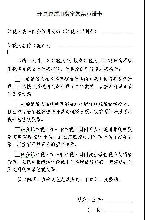 【例】2019921日,增值稅一般納稅人在增值稅稅率調(diào)整前已按原16%、10%適用稅率開具的增值稅發(fā)票,發(fā)現(xiàn)開票有誤需要重新開具的,應(yīng)向主管稅務(wù)機(jī)關(guān)提交《開具原適用稅率發(fā)票承諾書》,辦理臨時開票權(quán)限,必須在24小時內(nèi),先按照原適用稅率開具紅字發(fā)票后,再重新開具正確的藍(lán)字發(fā)票。